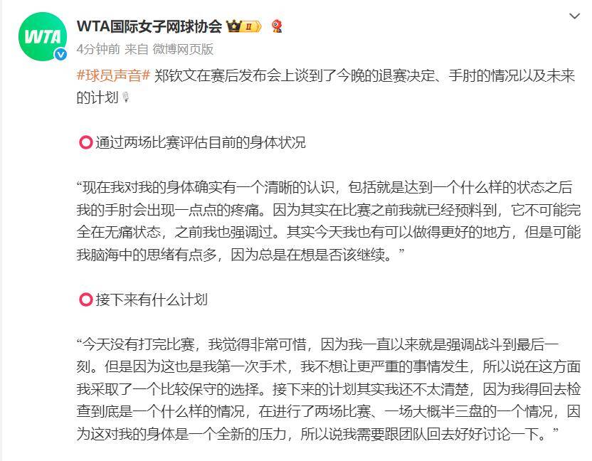赛后,郑钦文在发布会上谈到了自己的身体状况,表示目前的伤病仍然影响比赛状态。