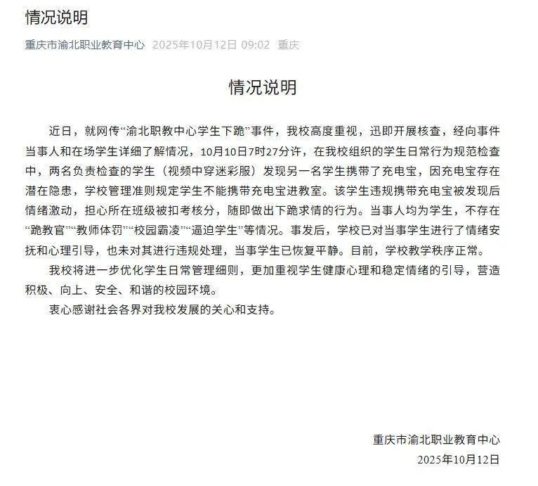 ·重庆渝北职教中心回应“学生下跪”事件:双方均为学生,不存在“跪教官”“教师体罚”“校园霸凌”等情况。