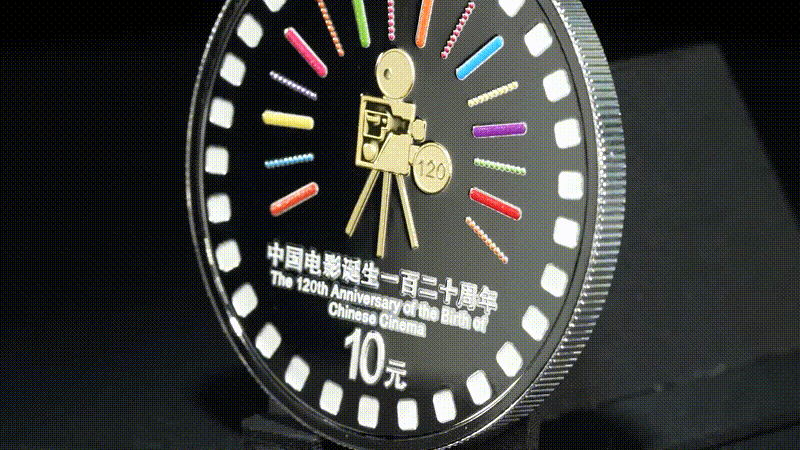 纪念币边缘的胶片齿孔直观唤醒人们对电影载体的经典记忆。金色摄影机是视觉核心,彰显电影制作的专业质感。从摄影机向四周辐射的多彩线年间中国电影孕育出的多元类型、鲜活故事与情感力量,体现艺术表达的丰富性;也喻示电影如光般照亮生活、滋养文化的精神价值。