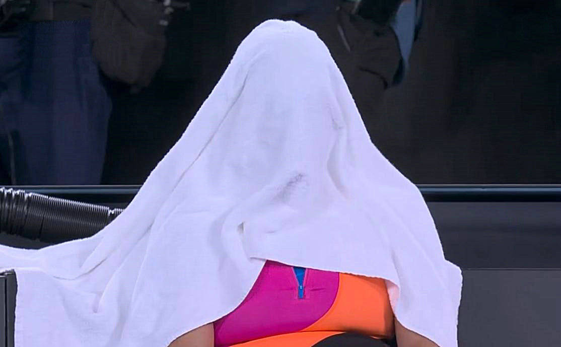 最后来猜一猜认一认。下面这张图片是一位球员局休时用毛巾蒙头。不作提示,您能认出她是谁吗?