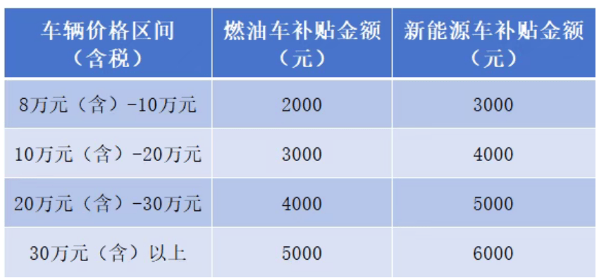 按机动车销售统一发票上注明的购车价格(含税价)分档给予一次性现金补贴,燃油车与新能源车补贴标准分别设定,具体如下: